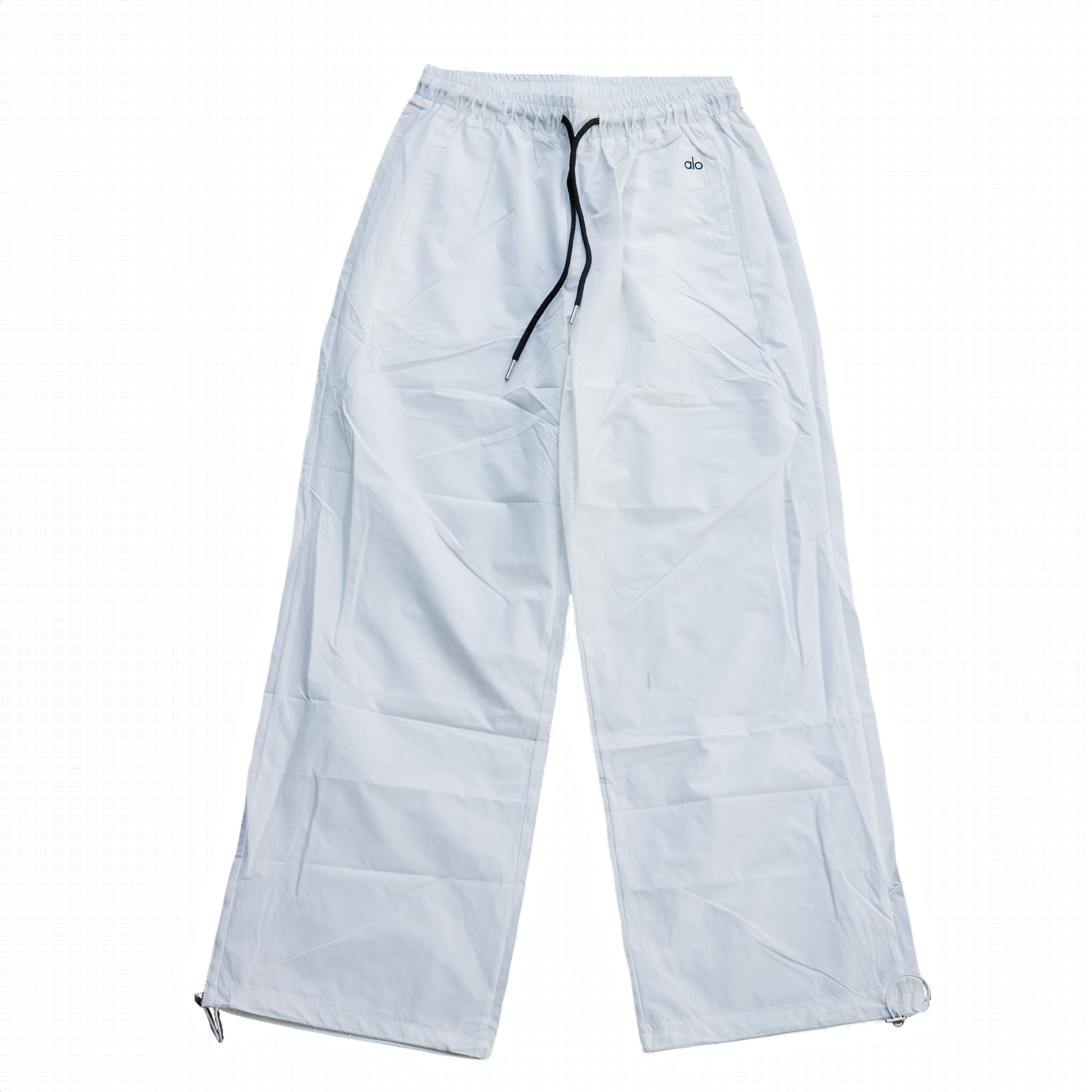 These are signature, relaxed-fit, full-length pants designed for comfort, layered looks, and versatile streetwear styling. They are made from a lightweight, woven nylon or technical fabric with a slightly crinkled finish. Key features include a comfortable elasticated, high waist and adjustable cinches at the ankle to customize the wide-leg silhouette. The small "alo" logo is discreetly embroidered or printed near the hip pocket.